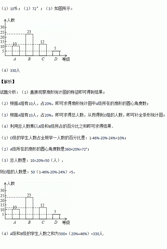 (4)若该校九年级有500名学生,请你用此样本估计体育测试中A级和B级的学生人数之和.