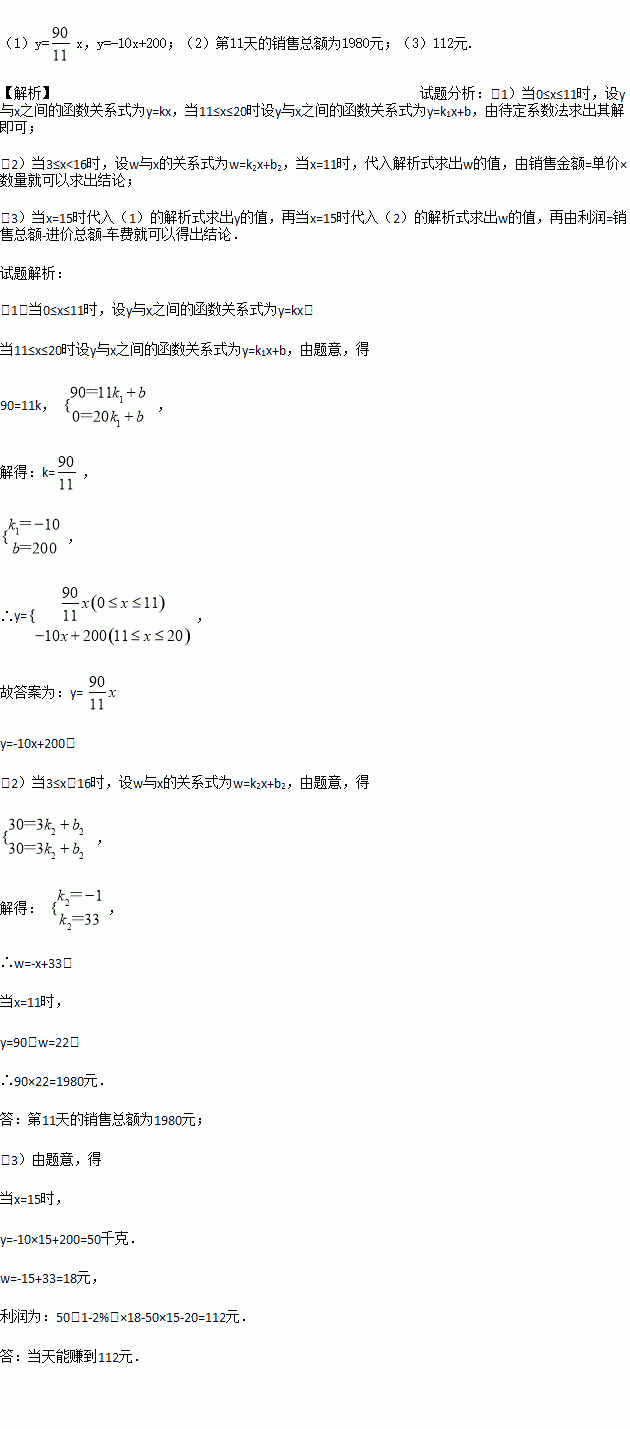 (3)若上市第15天时,爸爸把当天能销售的草莓批发给了邻居马叔叔,批发价为每千克15元,马叔叔到市场按照当日的价格w元/千克将批发来的草莓全部销售完,他在销售的过程中,草莓总质量损耗了2%.那么,马叔叔支付完来回车费20元后,当天能赚到多少元?