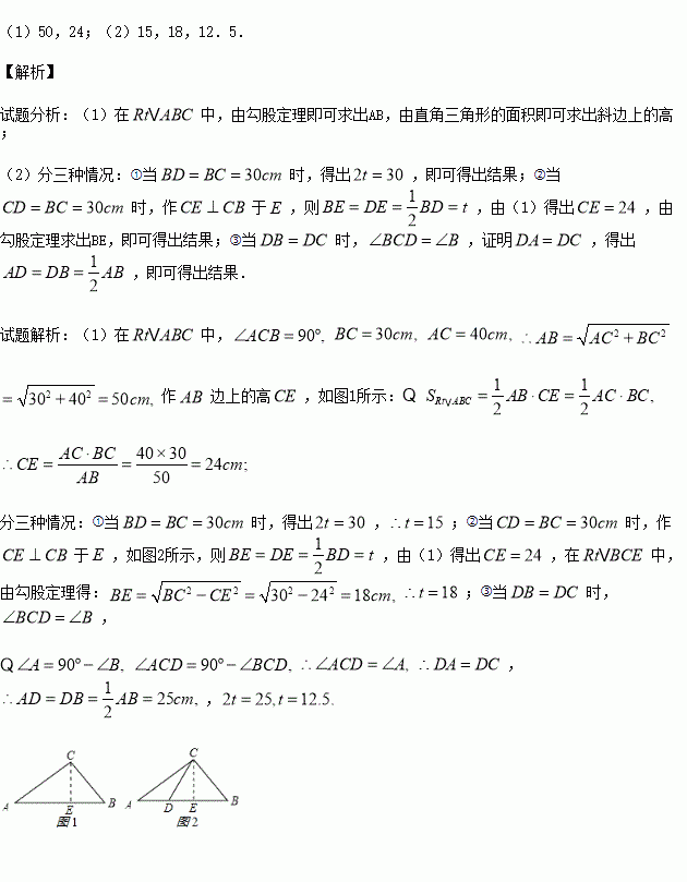 如图,在Rt△ABC中,∠ACB=90°,BC=30cm,AC=40cm,点D在线段AB上从点B出发,以2cm/s的速度向终点A运动,设点D的运动时间为t.