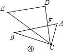 (4)如图④,根据平行线的性质由AB∥DE得到∠CFB=∠CDE=90°,再根据互余可计算出∠DCB的度数;