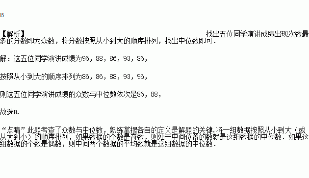 在学校开展的“争做最优秀中学生”的一次演讲比赛中,编号1,2,3,4,5的五位同学最后成绩如下表所示:那么这五位同学演讲成绩的众数与中位数依次是( )