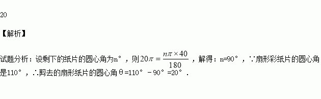 现有一张圆心角为110°,半径为40cm的扇形纸片,小红剪去圆心角为θ的部分扇形纸片后,将剩下的纸片制作成一个底面半径为10cm的圆锥形纸帽(接缝处不重叠),则剪去的扇形纸片的圆心角θ为 °.