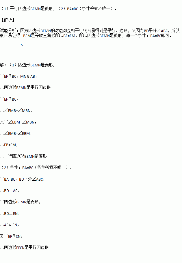 如图,已知△ABC中,BD平分∠ABC,点M是BD上一点,过M点作EF∥BC,分别交AB、AC于E、F,作MN∥AB交BC于N.