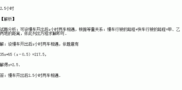 (2015秋•金乡县期末)甲、乙两地相距217.5km,一列快车和一列慢车分别从甲、乙两地出发,相向而行.已知慢车每小时行35km,快车每小时行65km,如果慢车先开0.5h,问慢车开出后几小时两车相遇?