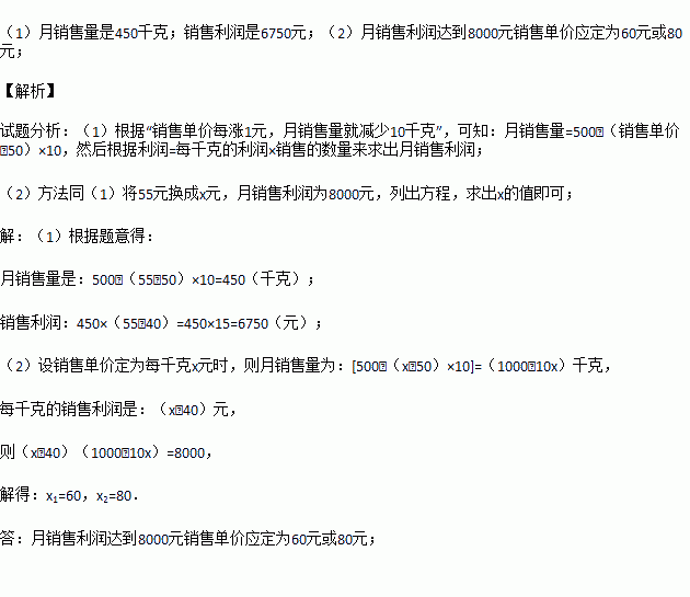 (1)当销售单价定位每千克55元时,计算月销售量和月销售利润;