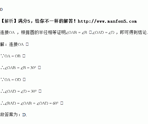 如图,已知AB、AD是⊙O的弦,∠B=30°,点C在弦AB上,连接CO并延长交⊙O于点D,∠D=30°,则∠BAD的度数是( )