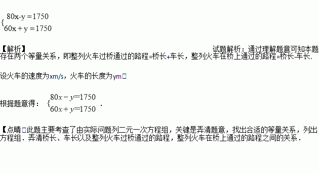 某铁路桥长1750m,现有一列火车从桥上通过,测得该火车从开始上桥到完全过桥共用了80s,整列火车完全在桥上的时间共60s;设火车的速度为xm/s,火车的长度为ym,根据题意得方程组为________________.