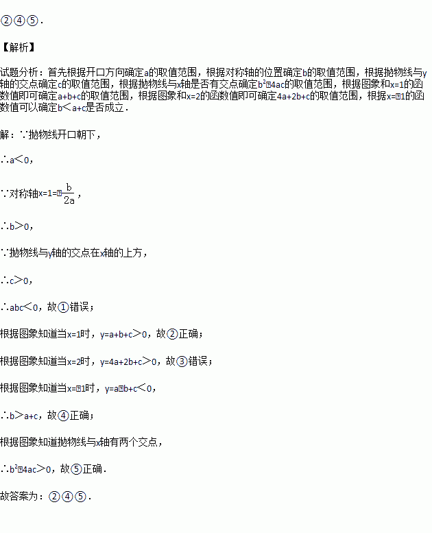 ①abc>0;②a+b+c>0;③4a+2b+c<0;④b>a+c;⑤b2﹣4ac>0.