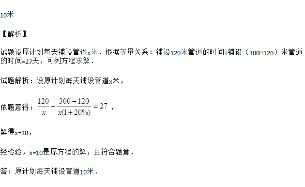 张家界市为了治理城市污水,需要铺设一段全长为300米的污水排放管道,铺设120米后,为了尽可能减少施工对城市交通所造成的影响,后来每天的工作量比原计划增加20%,结果共用了27天完成了这一任务,求原计划每天铺设管道多少米?