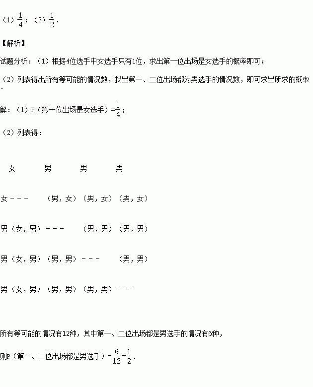 (2)请你用画树状图或列表的方法表示第一、二位出场选手的所有等可能结果,并求出他们都是男选手的概率.