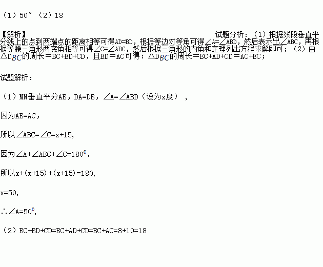 如图,等腰△ABC中,AB=AC=10,BC=8,∠DBC=15°,AB的垂直平分线MN交AC于点D,