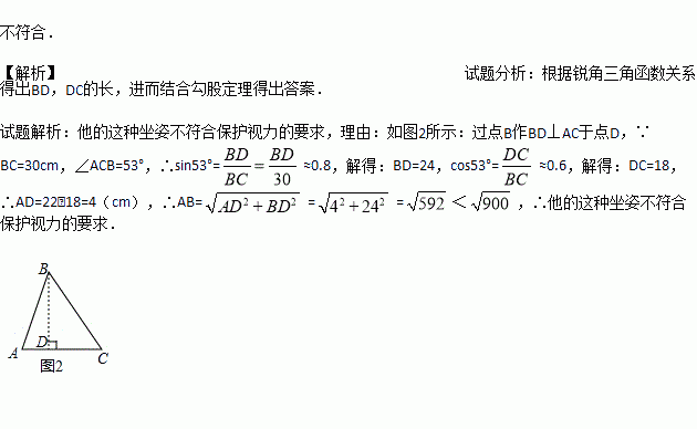 人写字时眼睛和笔端的距离超过30cm时则符合保护视力的要求.图1是一位同学的坐姿,把她的眼睛B、肘关节C和笔端A的位置关系抽象成图2的△ABC,BC=30cm,AC=22cm,∠ACB=530,她的这种坐姿符合保护视力的要求吗?请说明理由.(参考数据:sin530≈0.8,cos530≈0.6,tan530≈1.3)