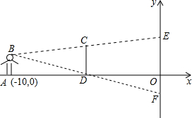 如图,在平面直角坐标系内,小聪站在距离y轴10m点A(-10,0)处观察y轴.眼睛距x轴1.5m,他的前方5m处有一障碍物CD,若CD=2m.求y轴上小聪看不到的EF的长,并求出E、F两点的坐标.