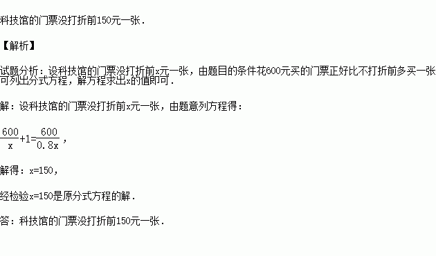 (2014秋•南京校级期末)小明到科技馆去买门票,正巧科技馆在搞优惠活动,每张门票按原价的八折出售,结果花600元买的门票正好比不打折前多买一张,问科技馆的门票没打折前多少元一张?