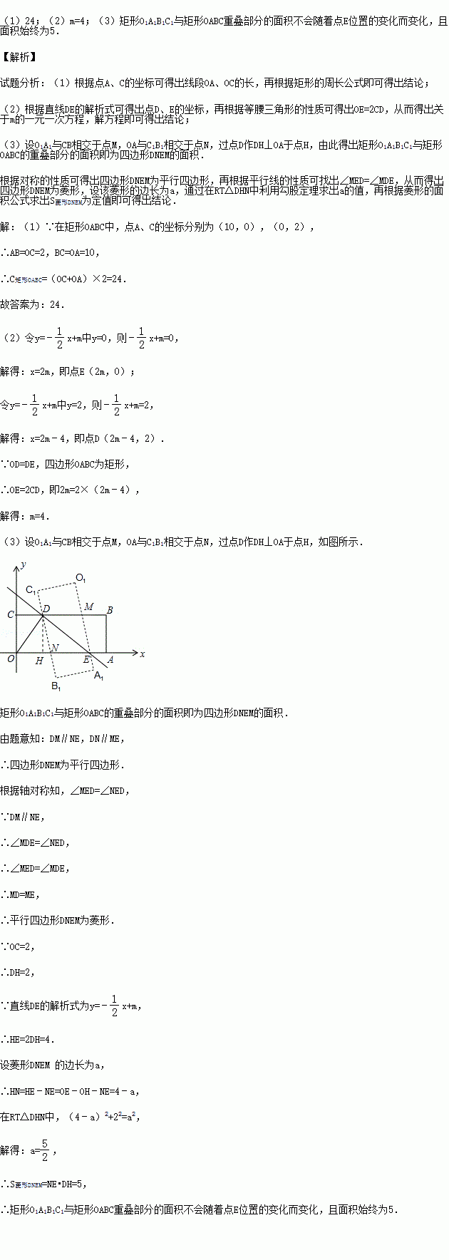 (3)若矩形OABC关于直线DE的对称图形为四边形O1A1B1C1,试探究四边形O1A1B1C1与矩形OABC重叠部分的面积是否会随着E点位置的变化而变化,若不变,求出该重叠部分的面积;若改变,请说明理由.