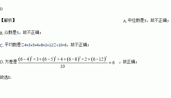A. 中位数是6.5 B. 众数是12 C. 平均数是3.9 D. 方差是6