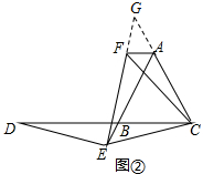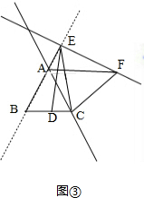 (2)首先根据点E在线段BA的延长线上,在图③的基础上将图形补充完整,然后判断出△CEF是等边三角形,即可判断出EF=EC,再根据ED=EC,可得ED=EF,∠CAF=∠BAC=60°,再判断出∠DBE=∠EAF,∠BDE=∠AEF;最后根据全等三角形判定的方法,判断出△EDB≌△FEA,即可判断出BD=AE,EB=AF,进而判断出AF=AB+BD即可.