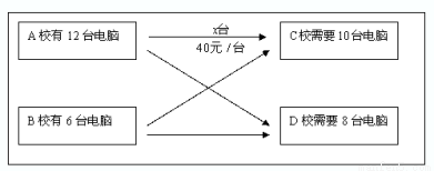 A校和B校分别库存有电脑12台和6台,现决定支援给C校10台和D校8台.已知从A校调运一台电脑到C校和D校的运费分别为40元和10元;从B校调运一台电脑到C校和D校的运费分别为30元和20元.