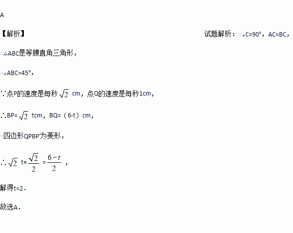 如图,在Rt△ABC中,∠C=90°,AC=BC=6cm,点P从点B出发,沿BA方向以每秒