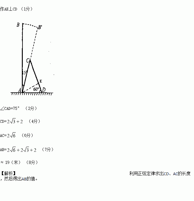 每年的6至8月份是台风多发季节,某次台风来袭时,一棵大树树干AB(假定树干AB垂直于地面)被刮倾斜15°后折断倒在地上,树的项部恰好接触到地面D(如图所示),量得树干的倾斜角为∠BAC=15°,大树被折断部分和地面所成的角∠ADC=60°,