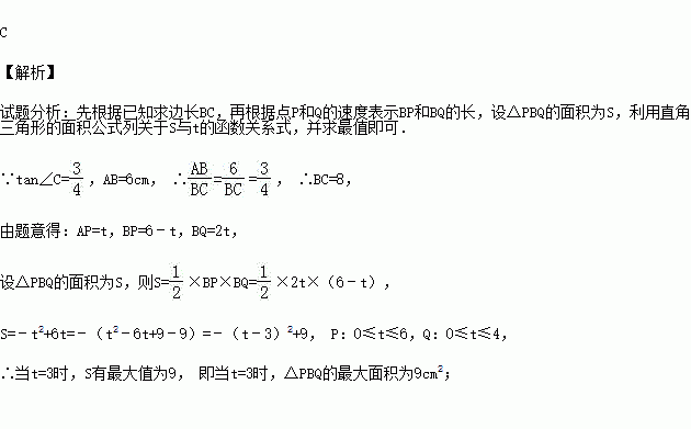 ,AB=6cm.动点P从点A开始沿边AB向点B以1cm/s的速度移动,动点Q从点B开始沿边BC向点C以2cm/s的速度移动.若P,Q两点分别从A,B两点同时出发,在运动过程中,△PBQ的最大面积是( )