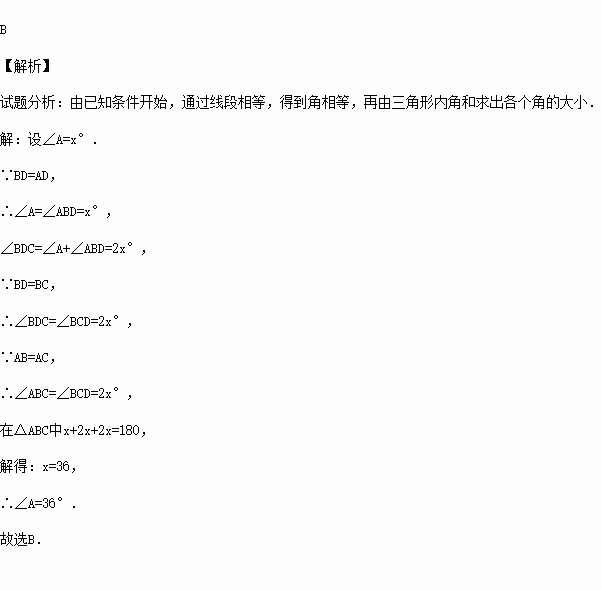 (2015秋•海门市期末)如图,△ABC中,AB=AC,AD=BD=BC,则∠A的度数是( )