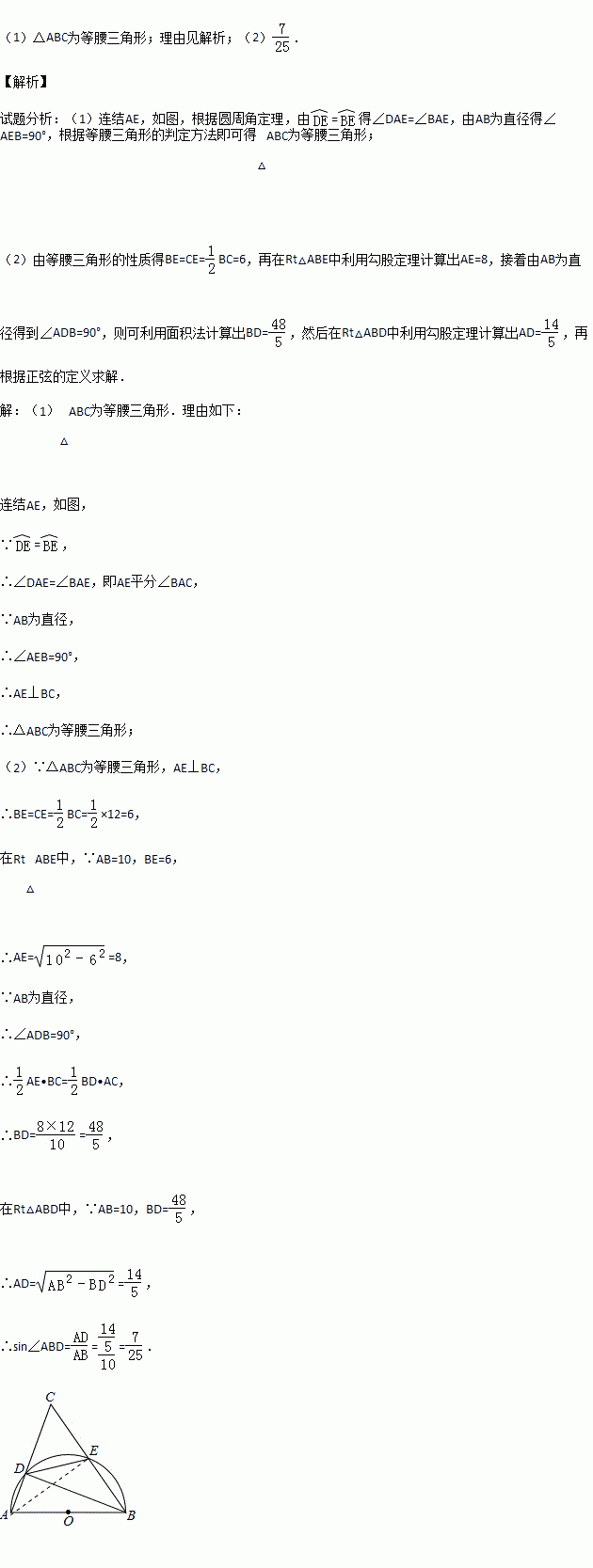 (2)已知半圆的半径为5,BC=12,求sin∠ABD的值.