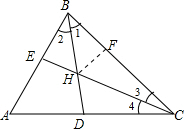 分析 根据角平分线的定义得到∠1=∠2,∠3=∠4,再根据三角形内角和定理得到∠1+∠3+∠BHC=180°,∠1+∠2+∠3+∠4+∠A=180°,利用等量代换得到2(180°-∠BHC)+∠A=180°,即有∠BHC=90°+$\frac{1}{2}$∠A=120°,从而求得∠BHE=60°,在BC上截取BF=BE,连接FH,由SAS证得△BHE≌△BHF(SAS),得出∠BHF=∠BHE=60°,进一步得出∠CHF=60°,由∠DHC=∠BHE=60°,得出∠DHC=∠CHF,即可根据AAS证得△DHC≌△FHC,证得DC=FC,从而证得BE+DC=BC.