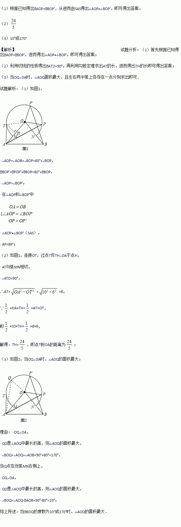 如图所示,△OAB中,OA=OB=10,∠AOB=80°,以点O为圆心,6为半径的优弧