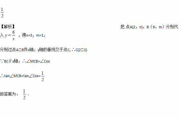 上的两点,分别过点A,B 作x 轴,y 轴的垂线交于点C,OC 的延长线与AB交于点M,则tan∠MCB=_________.
