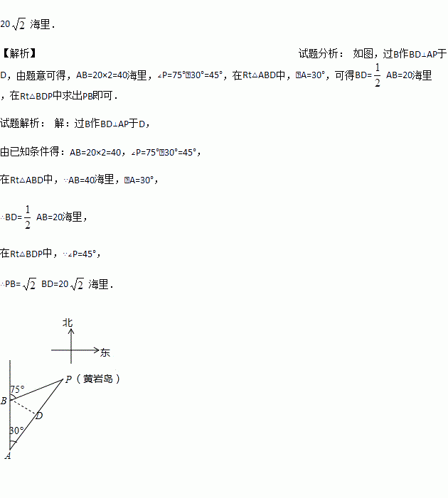 如图,三沙市一艘海监船某天在黄岩鸟P附近海域由南向北巡航,某一时刻航行到A处,测得该岛在北偏东30°方向,海监船以20海里/时的速度继续航行,2小时后到达B处,测得该岛在北偏东75°方向,求此时海监船与黄岩岛P的距离BP的长.(参考数据:
