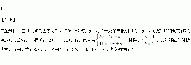 如图,小明购买一种笔记本所付款金额y(元)与购买量x(本)之间的函数图象由线段OB和射线BE组成,则一次购买8个笔记本比分8次购买每次购买1个可节省 元.
