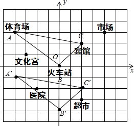 (3)把体育场、宾馆和火车站的横坐标不变,纵坐标减去4描出各点即可得到△A′B′C′;
