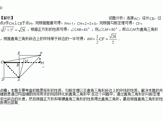 如图,在正方形ABCD中,AB=2,延长AB至点E,使得BE=1,EF⊥AE,EF=AE.分别连接AF,CF,M为CF的中点,则AM的长为( )