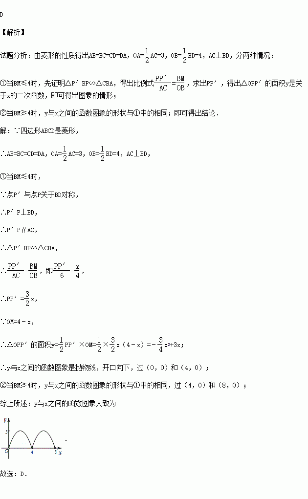 如图,菱形ABCD的对角线AC,BD相交于点O,AC=6,BD=8,动点P从点B出发,沿着B﹣A﹣D在菱形ABCD的边上运动,运动到点D停止,点P′是点P关于BD的对称点,PP′交BD于点M,若BM=x,△OPP′的面积为y,则y与x之间的函数图象大致为( )