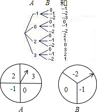 有两个可以自由转动的均匀的转盘A、B,转盘分别分为4与3等分,及标有数字,(如图).小明与小聪同学用这两个转盘做游戏,游戏规则如下:①分别转动转盘A与B一次:②转盘停止后,将指针所指的数字相加(如果指针恰好停在等分线上,则重转,直到指针指向某一数字为止)如果和为非负数,小明胜,否则小聪胜.