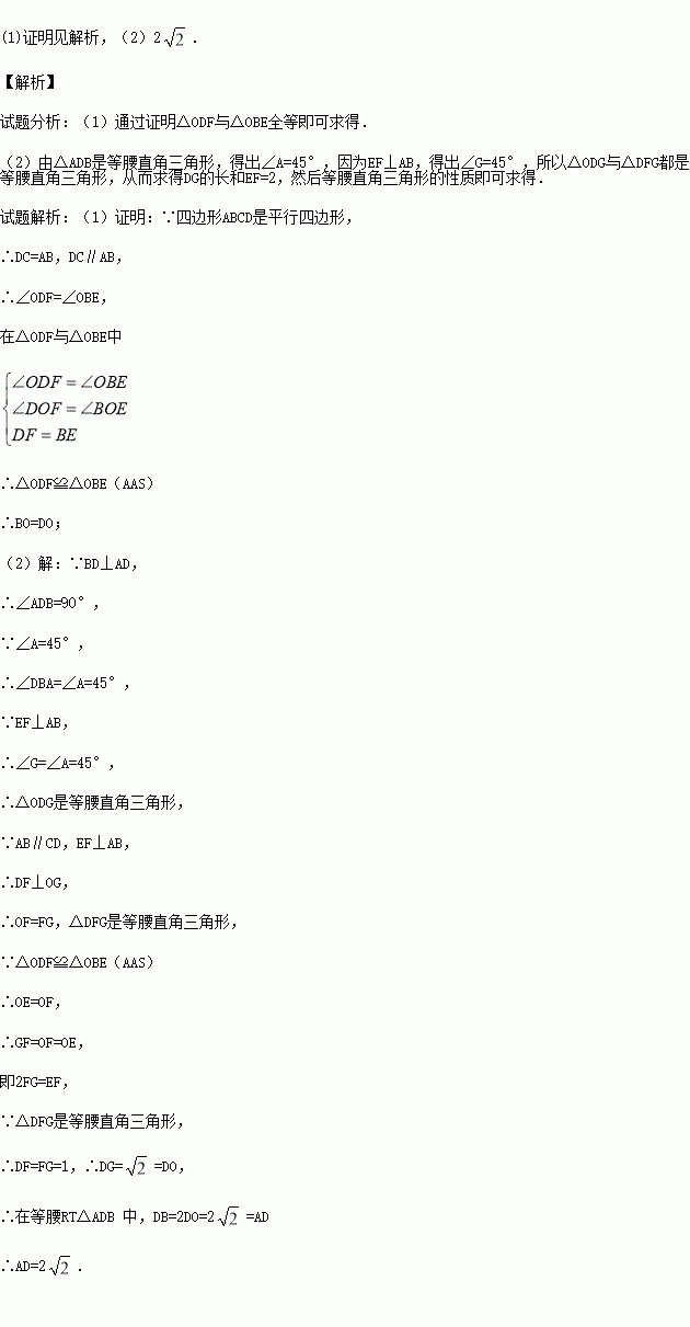 如图,?ABCD中,BD⊥AD,∠A=45°,E、F分别是AB,CD上的点,且BE=DF,连接EF交BD于O.