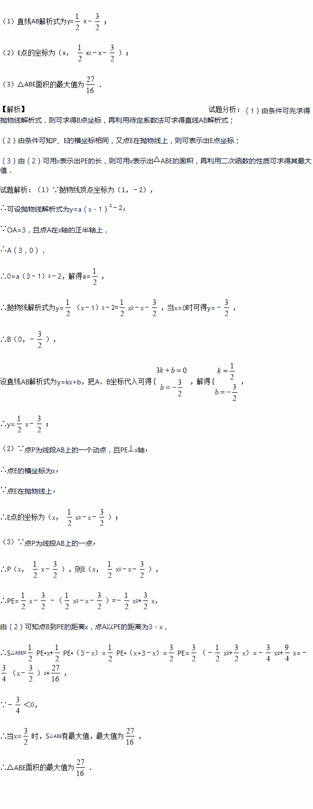 如图,抛物线的顶点为C(1,﹣2),直线y=kx+m与抛物线交于A、B来两点,其中A点在x轴的正半轴上,且OA=3,B点在y轴上,点P为线段AB上的一个动点(点P与点A、B不重合),过点P且垂直于x轴的直线与这条抛物线交于点E.