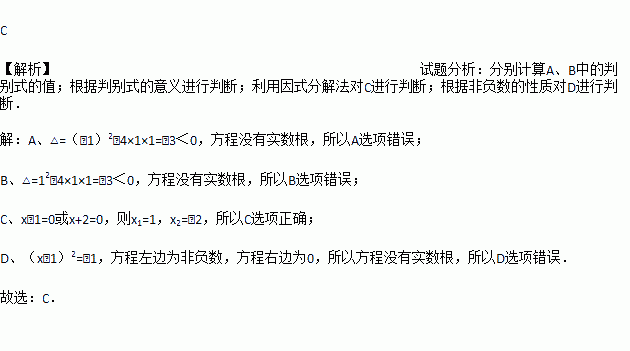 A. x2﹣x+1=0 B. x2+x+1=0 C. (x﹣1)(x+2)=0 D. (x﹣1)2+1=0