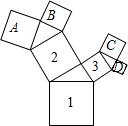 分析:根据勾股定理有S正方形2+S正方形3=S正方形1,S正方形C+S正方形D=S正方形3,S正方形A+S正方形B=S正方形2,等量代换即可求四个小正方形的面积之和.