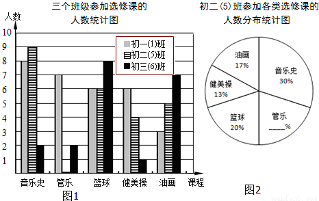 为响应推进中小学生素质教育的号召,某校决定在下午15点至16点开设以下选修课:音乐史、管乐、篮球、健美操、油画.为了解同学们的选课情况,某班数学兴趣小组从全校三个年级中各调查一个班级,根据相关数据,绘制如下统计图.