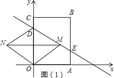 (3)当四边形OMDN是菱形时,如图(1),M的纵坐标是$\frac{3}{2}$,把y=$\frac{3}{2}$代入y=-$\frac{2}{3}$x+3,得-$\frac{2}{3}$x+3=$\frac{3}{2}$,解得:x=$\frac{9}{4}$,