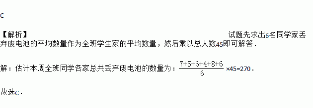 为了让人们感受丢弃废旧电池对环境造成的影响,某班环保小组的6名同学记录了自己家中一个月内丢弃废电池的数量,结果如下(单位:个):7,5,6,4,8,6,如果该班有45名学生,那么根据提供的数据估计该月全班同学各家总共丢弃废旧电池的数量约为( )