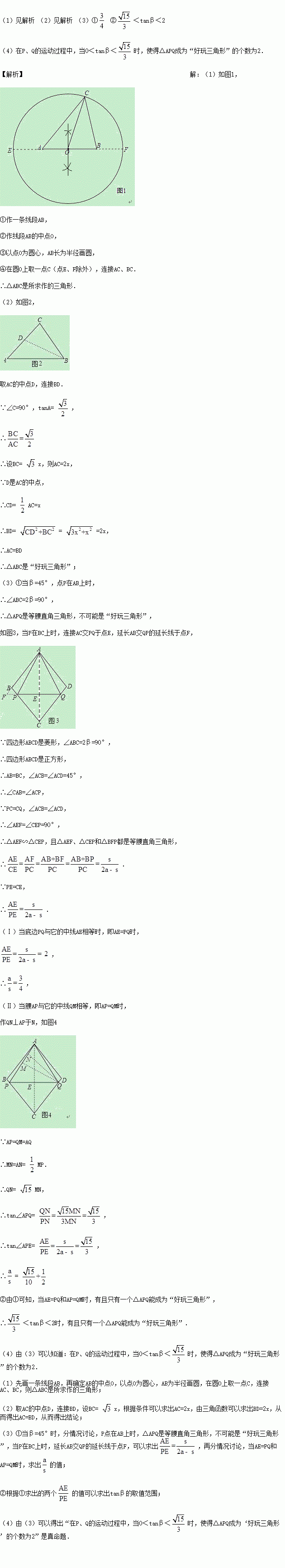 (4)依据(3)的条件,提出一个关于“在点P,Q的运动过程中,tanβ的取值范围与△APQ是‘好玩三角形’的个数关系”的真命题(“好玩三角形”的个数限定不能为1)