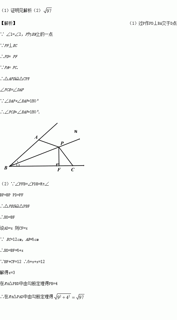 如图,已知∠1=∠2,P为BN上的一点,PF⊥BC于F,PA=PC.