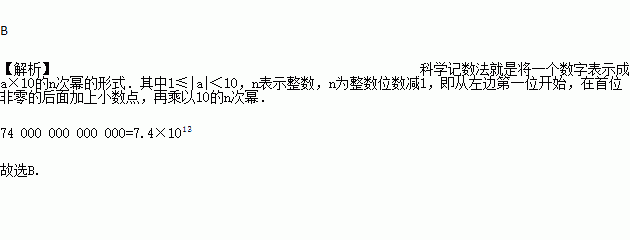 2016年全国国民生产总值约为74 000 000 000 000元,比上年增长6.7%,将74 000 000 000 000元用科学计数法表示为( )元