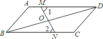 如图,AB=CD,AD=BC,O为BD上任意一点,过O点的直线分别交AD、BC于M、N两点.求证:∠1=∠2.