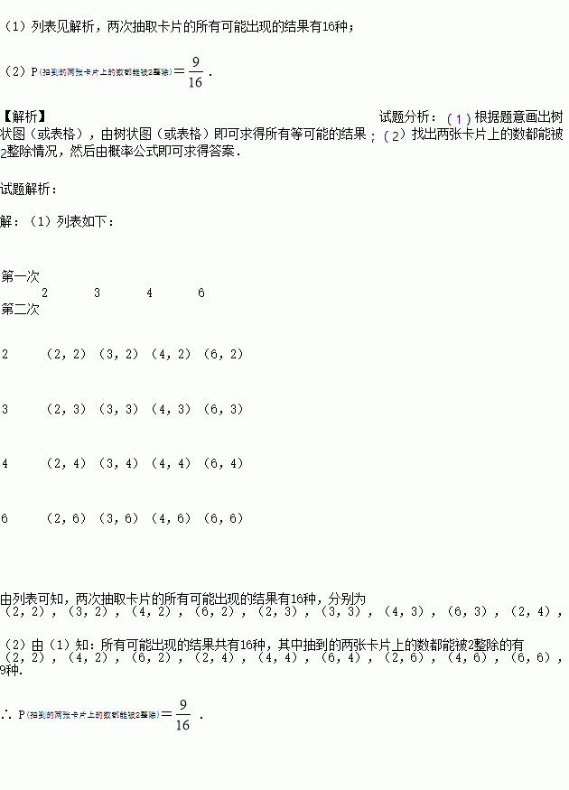 小丽和小明玩数学游戏,小丽取出一个不透明的口袋,口袋中装有四张分别标有数字2,3,4,6的卡片,卡片除数字外其余都相同,小丽要求小明从中随机抽取一张卡片并记录下卡片上的数字,将卡片放回洗匀,再次从中随机抽取一张卡片,同样记录下卡片上的数字.