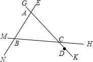 解答 解:如图,有14条射线,能用字母表示的分别为射线AB,射线AC,射线AE,射线AG,射线BA,射线BC,射线BM,射线BN,射线CA,射线CB,射线CH,射线CD,射线DA,射线DK.
