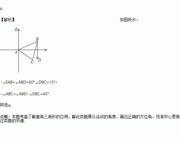 某人从A点出发向北偏东60°方向速到B点,再从B点出发向南偏西15°方向速到C点,则∠ABC等于( )度